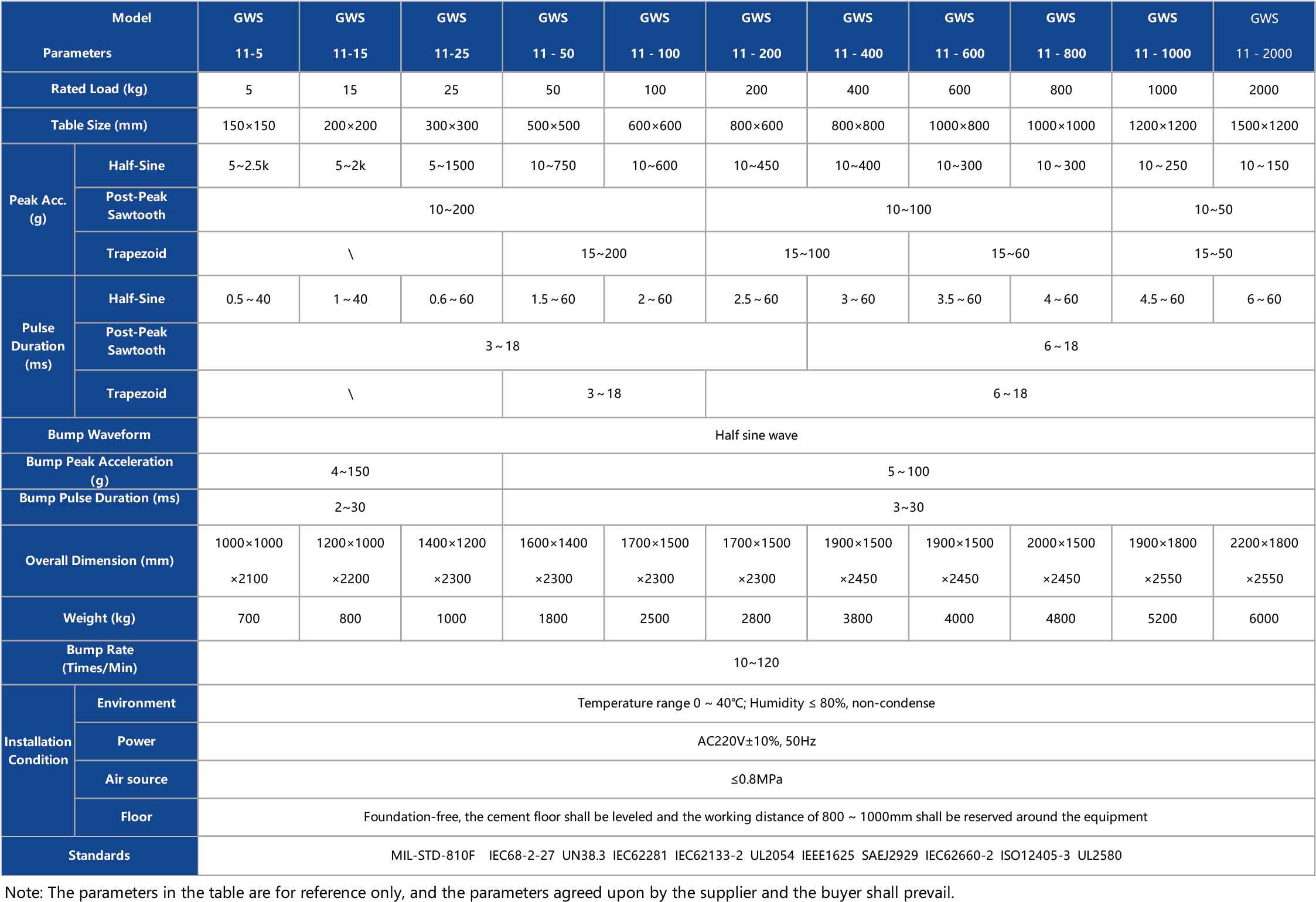 يُعد نظام اختبار الصدمات العمودية الهوائية من سلسلة GWS11 مناسبًا لتقييم الموثوقية الوظيفية والسلامة الهيكلية لمختلف المنتجات في بيئات الصدمات أو الاصطدامات، مما يُسهم في تحسين أو تطوير التصميم الهيكلي أو تخطيط المنتجات. يلبي النظام متطلبات كلٍ من اختبارات الصدمات والاصطدامات، ويمكنه إجراء اختبارات الصدمات التقليدية باستخدام موجات نصف جيبية، وموجات سن المنشار بعد الذروة، وموجات شبه منحرفة، وغيرها من أشكال الموجات.